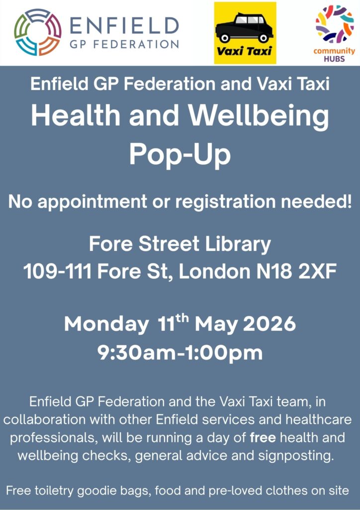 Enfield GP Federation and Vaxi Taxi invite all local residents to attend the Health and Wellbeing Pop-Up event. This event at Fore Street Library is completely FREE and there is no appointment or registration required.